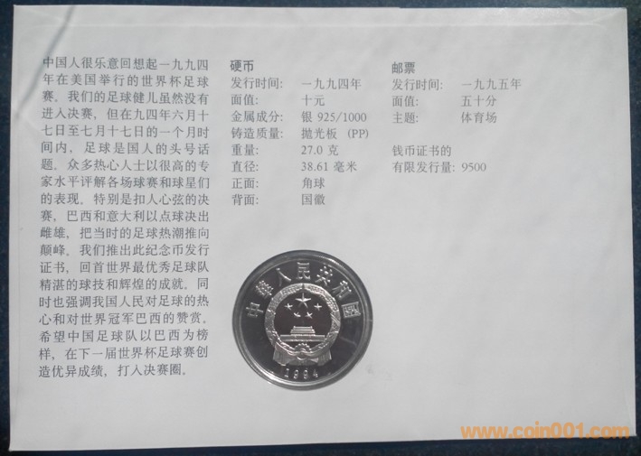 中國1994年世界杯足球賽角球10元紀(jì)念銀幣封 1000元
