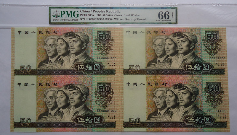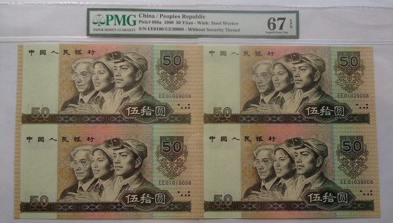 尤其是8050四連體鈔 是連體鈔唯一 存在大量裁切的 屬于消耗量最大的連體品種!存世量還低于流通鈔 很多都已經(jīng)裁切了EE單張去配第四版人*民*幣大全套了,8050四連體絕對是性價比之王!靚號高分稀罕!