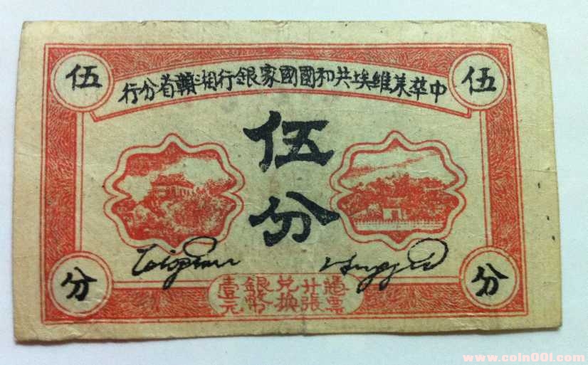 此枚為土地革命戰(zhàn)爭,時期蘇區(qū)的人民貨幣,為統(tǒng)一金融根據(jù)蘇區(qū)中央局指示,于1933年2月將中華蘇維埃共和國湘贛省工農(nóng)銀行改稱為中華蘇維埃共和國國家銀行湘贛省分行,行長仍由原行長譚余保擔(dān)任。同時發(fā)行銅元券及銀元券五種,流通于湘贛根據(jù)地境內(nèi)。1934年8月,紅軍撤出根據(jù)地后,即停止發(fā)行。