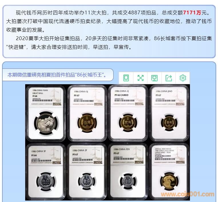 現(xiàn)代錢幣網(wǎng)歷時(shí)四年成功舉辦了11次大拍,共成交4887項(xiàng)拍品,總成交額7171萬元。春秋大拍屢次打破中國(guó)現(xiàn)代流通硬幣拍賣紀(jì)錄,大幅提高了現(xiàn)代錢幣的收藏地位,推動(dòng)了錢幣收藏事業(yè)的發(fā)展。