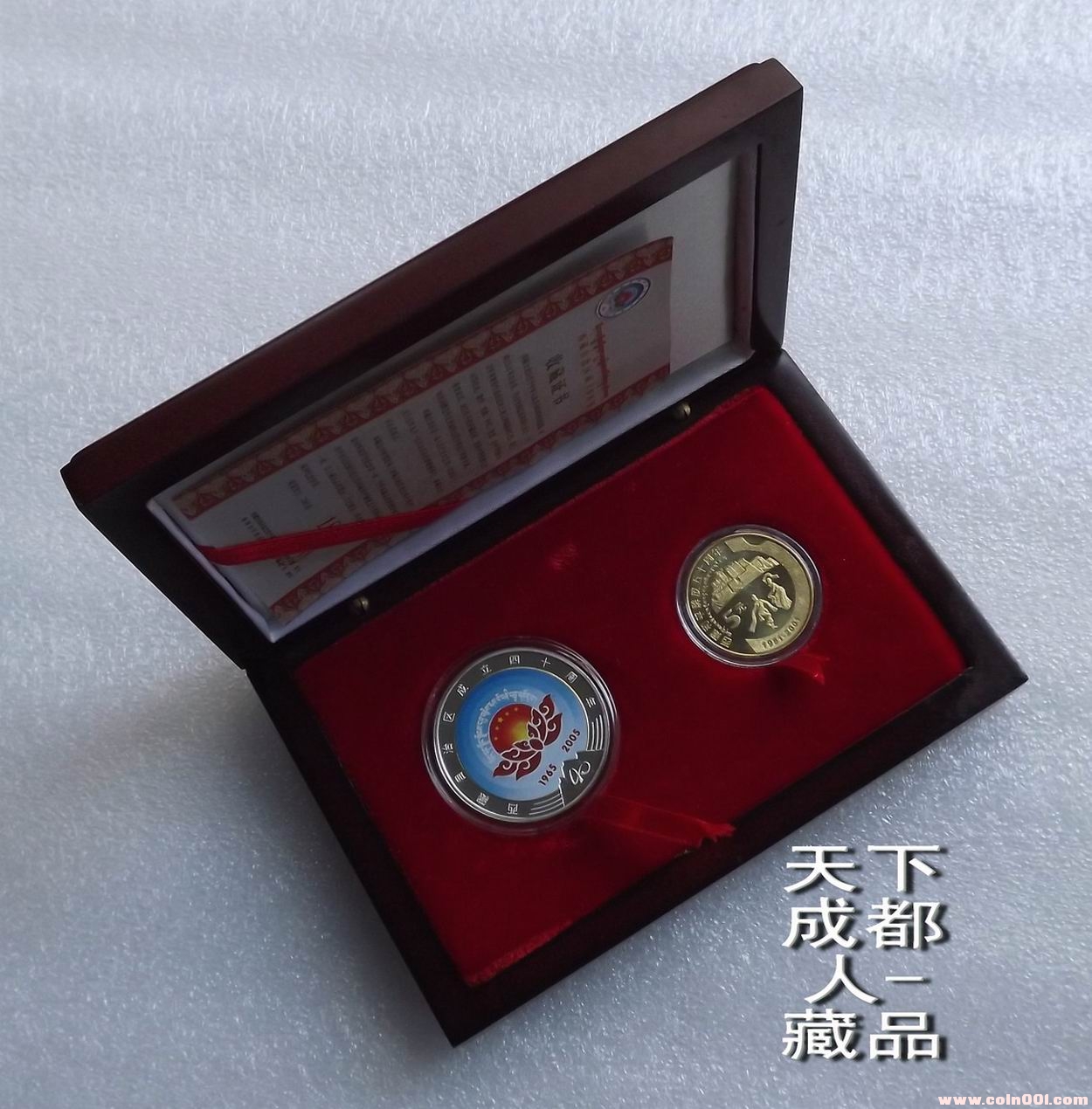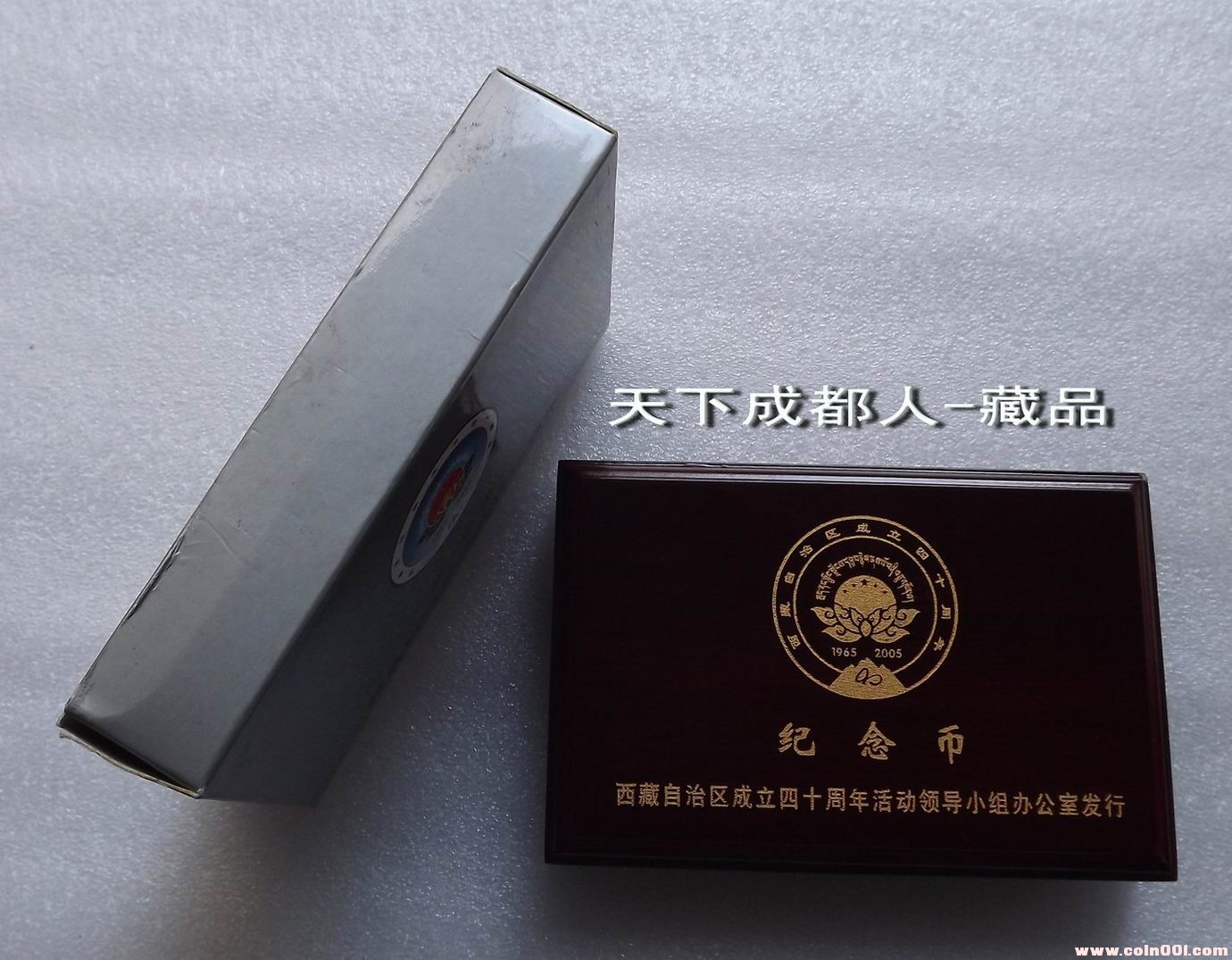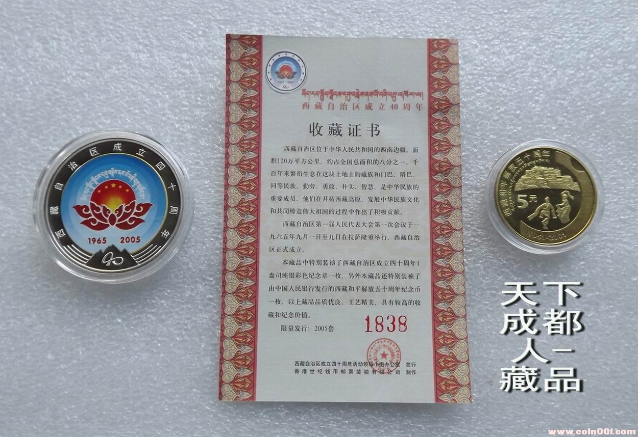 民族題材、少見(jiàn)禮品盒:2005年由西藏自治區(qū)成立四十周年活動(dòng)領(lǐng)導(dǎo)小組辦公室發(fā)行、香港世紀(jì)錢(qián)幣郵票裝幀有限公司制作《西藏自治區(qū)成立立四十周年紀(jì)念禮盒》原盒1幣1彩銀章;盒內(nèi)分別含新西藏紀(jì)念幣1枚、純銀彩銀紀(jì)念章(重量一盎司、成色99.9、直徑40毫米),限鑄2005套。原外紙盒內(nèi)木質(zhì)禮盒精美包裝,隨附帶編號(hào)收藏證書(shū)1份;品質(zhì)優(yōu)良、工藝精美,具有較高收藏和紀(jì)念價(jià)值,您值得珍藏(品如實(shí)物圖):