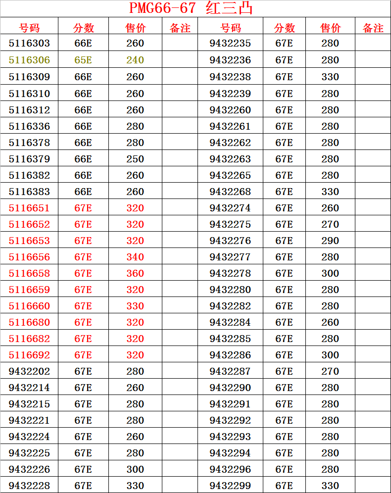 號碼 分數(shù) 售價 號碼 分數(shù)售價