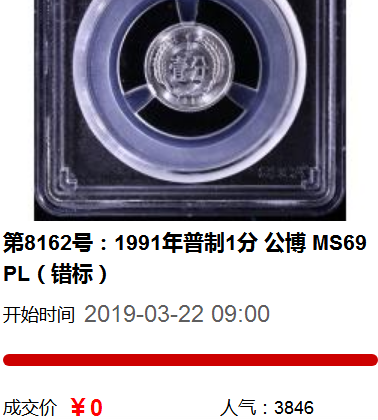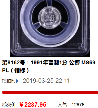 敬請(qǐng)關(guān)注2019年春秋大拍拍品第8162號(hào):1991年普制1分 公博 MS69PL(錯(cuò)標(biāo))