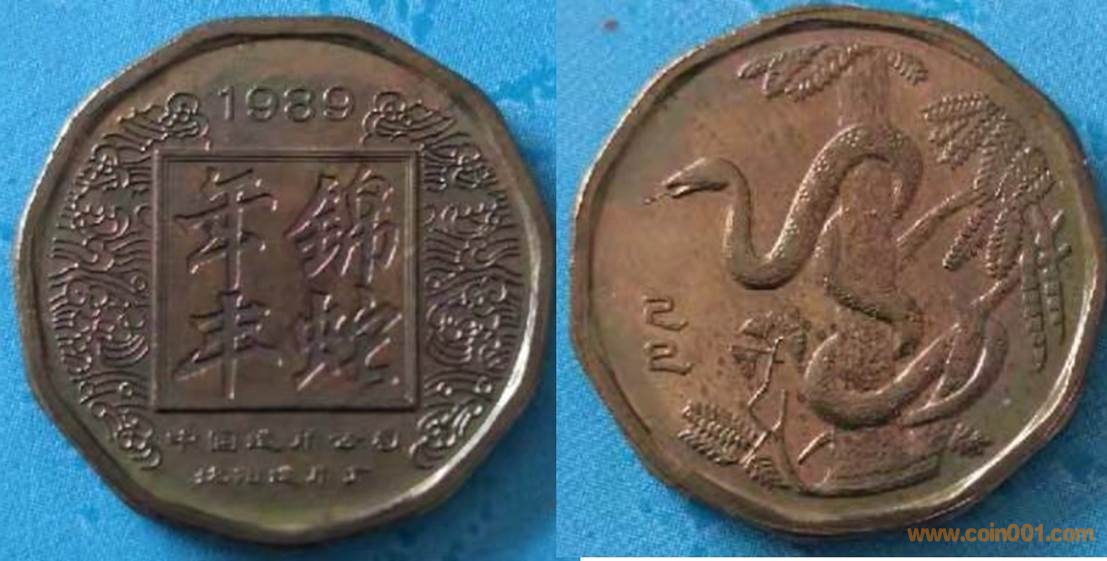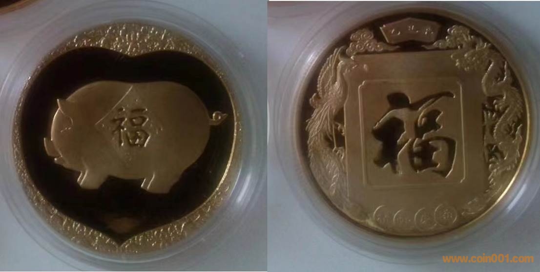 1983年制造,黃銅精制33mm上幣發(fā)行。正面為豬,反面為中國硬幣。