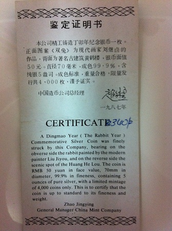 出售1987年5盎司銀兔帶 ..
