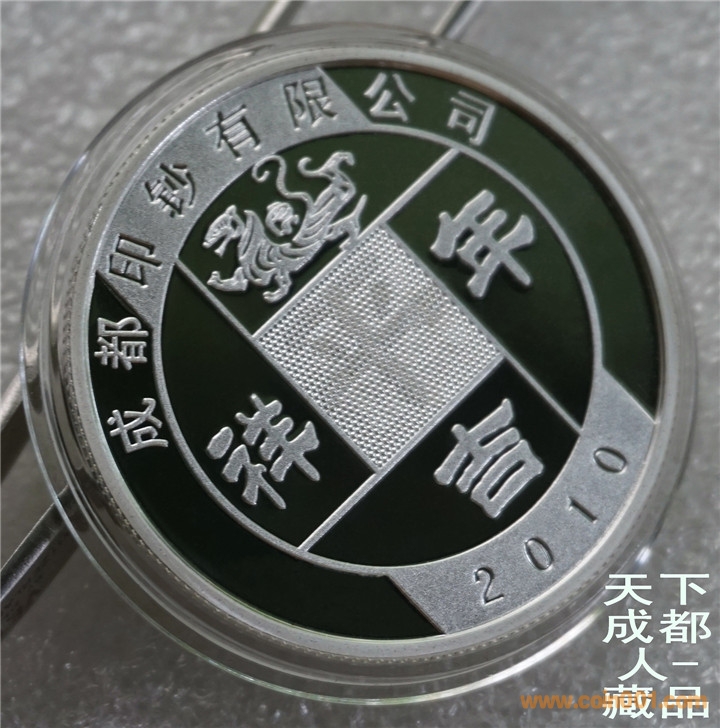 四重潛影工藝、生肖彩色銀章:中國印鈔造幣總公司成都印鈔公司鑄造《2010年生肖虎(精制雙色)潛影彩銀紀(jì)念章》原盒證1枚裝;材質(zhì)純銀、雙色彩色精制帶齒邊工藝,采用四重潛影防偽技術(shù)幣形鑄造工藝、重量一盎司、成色99.9%、直徑40毫米、限量發(fā)行。成鈔司原木盒內(nèi)精美包裝,隨附帶編號含水印鑒定證書1份。