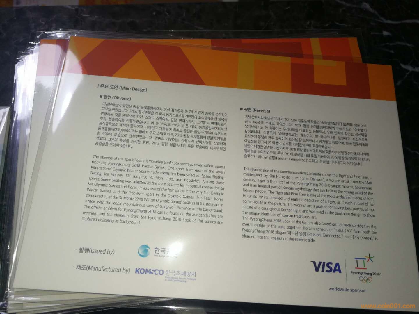 [font=tahoma, arial, &quot]75mm。紙*幣正面印有速滑、冰球、冰壺、冬季[font=tahoma, arial, &quot]項、長撬、雙人雪橇、跳臺滑雪等8項冬奧會比賽項目的圖案,反面印有朝鮮王朝時期著名畫家金弘道的名畫《松下猛虎圖》,畫中