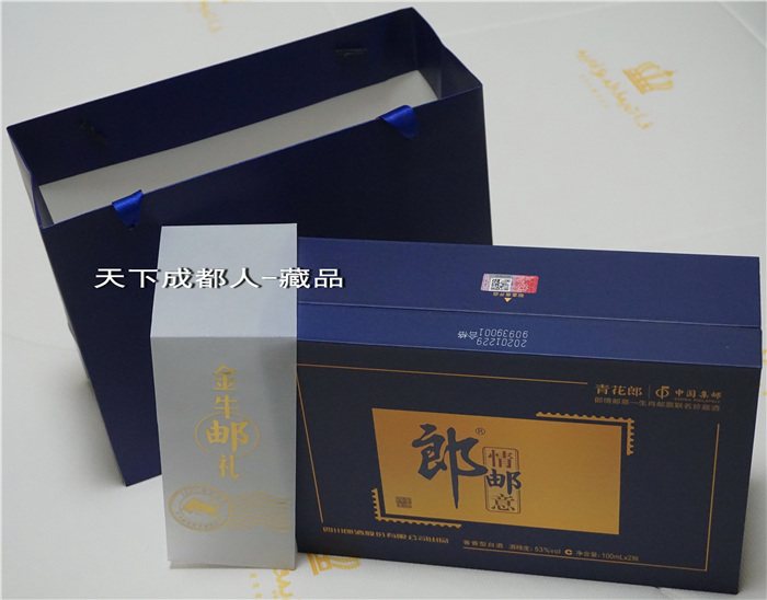 中國(guó)集郵總公司定制《2021年金牛郵禮郎情郵意-青花郎醬香型2瓶白酒》原禮盒100克*22瓶白酒配2只小酒杯裝;該醬香型白酒由跨國(guó)名酒:四川郎酒有限責(zé)任公司于2020年12月29日出品,名牌:青花郎VIP尊享,醬香型白酒、酒精度數(shù)53度、每瓶100克*2瓶共200克,隨配兩只玻璃小酒杯。中國(guó)集郵總公司原禮盒印制二維條形碼,質(zhì)量保證、重量合格、制作精制。適合個(gè)人收藏及饋贈(zèng)親朋好友(品如實(shí)物圖):