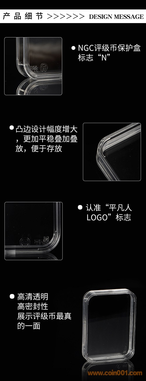 現(xiàn)在,平凡人根據(jù)市場的反饋,推出【平凡人NGC、PCGS評級幣保護(hù)盒】,該保護(hù)盒采用德國進(jìn)口特級亞克力原材料制作,超高的透明性、密封性,保證了評級幣裝在保護(hù)盒內(nèi)也能清晰的觀賞,既能保護(hù)收納,又能放心把玩。摔了也不在怕的!并且四角做了疊加存放設(shè)計,即使堆的再高,也能輕松穩(wěn)定,不易散落。新品發(fā)售期特惠,NGC/PCGS保護(hù)盒一個只要4元,30個起包郵。(不含偏遠(yuǎn)地區(qū)),下單前聯(lián)系確認(rèn)。