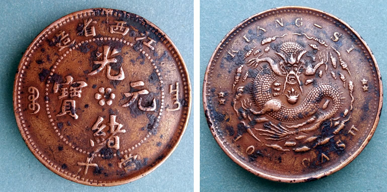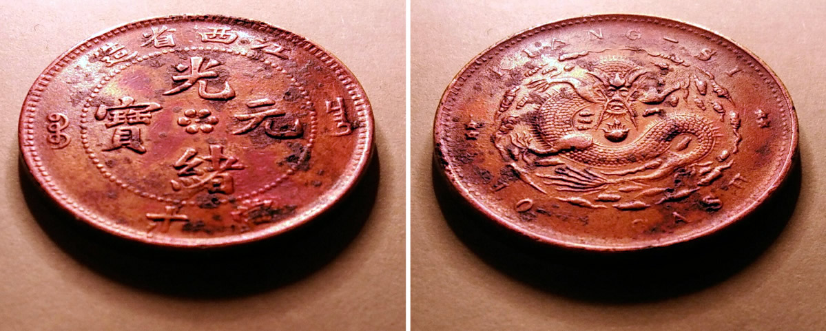 該幣應(yīng)該比正常幣要厚一些,《中國錢幣大辭典.清篇.銅元卷》上介紹該“江西光緒元寶.當(dāng)十.寶昌.缶寶字”類的直徑28.2——28.25毫米之間,厚度在1.65——1.75毫米之間,重量在6.5——7.3克之間。書中記錄一枚“連缶寶大鼻無齒龍”的數(shù)據(jù)是“直徑28.2毫米、厚度1.68毫米、重量7.15克”,但上述銅幣磨損后還有28.1毫米的直徑、1.82毫米厚、7.28克。