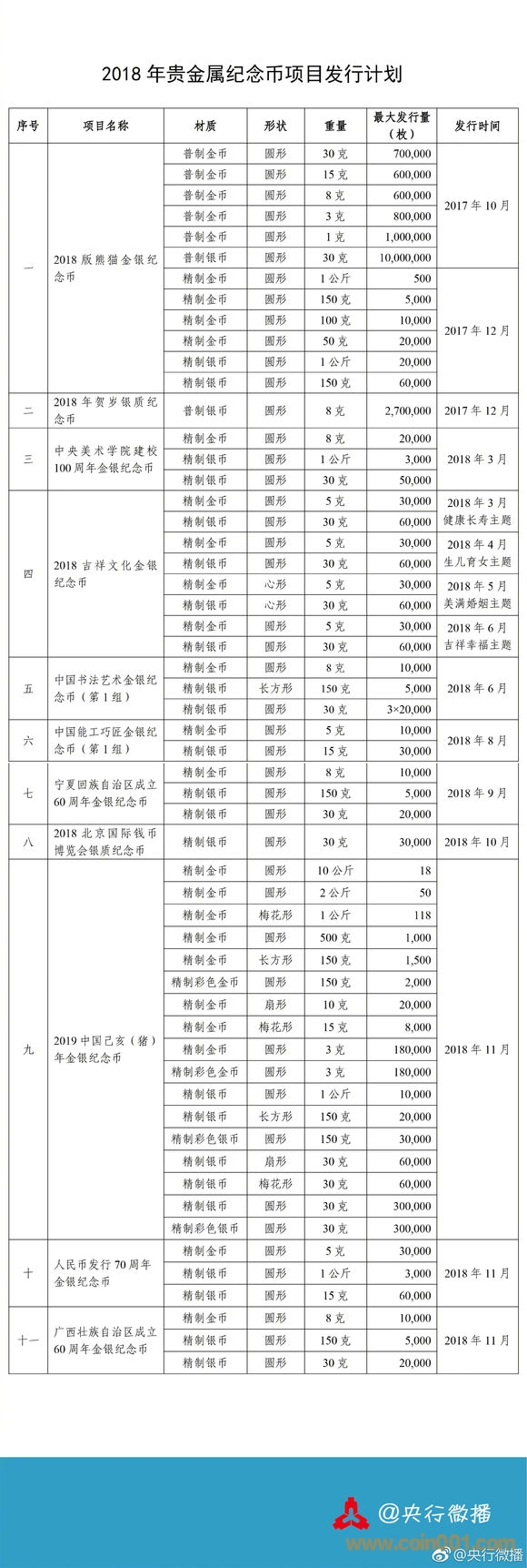 這11個項目是:2018版熊貓金銀紀念幣、2018年賀歲銀質(zhì)紀念幣、中央美術學院建校100周年金銀紀念幣、2018吉祥文化金銀紀念幣、中國書法藝術金銀紀念幣(第1組)、中國能工巧匠金銀紀念幣(第1組)、寧夏回族自治區(qū)成立60周年金銀紀念幣、2018北京國際錢幣博覽會銀質(zhì)紀念幣、2019中國己亥(豬)年金銀紀念幣、人民幣發(fā)行70周年金銀紀念幣和廣西壯族自治區(qū)成立60周年金銀紀念幣。