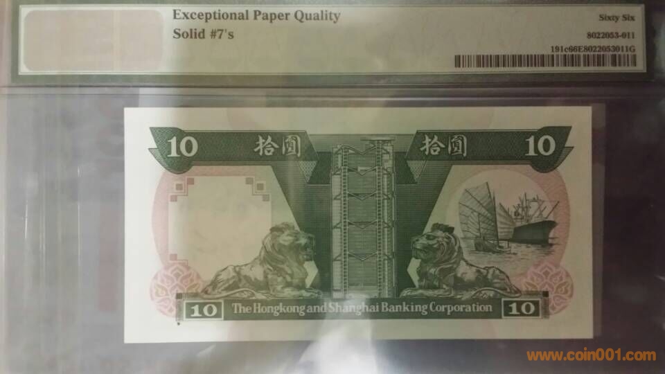 圖片:1992年,香港上海匯豐銀行拾圓,XW,777777,PMG,66,EPQ,背面.jpg