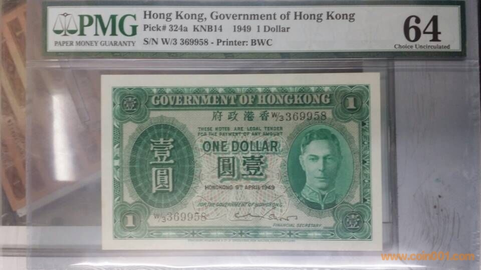 3)1949年,香港政府壹圓,W3,369958,PMG,64 750元