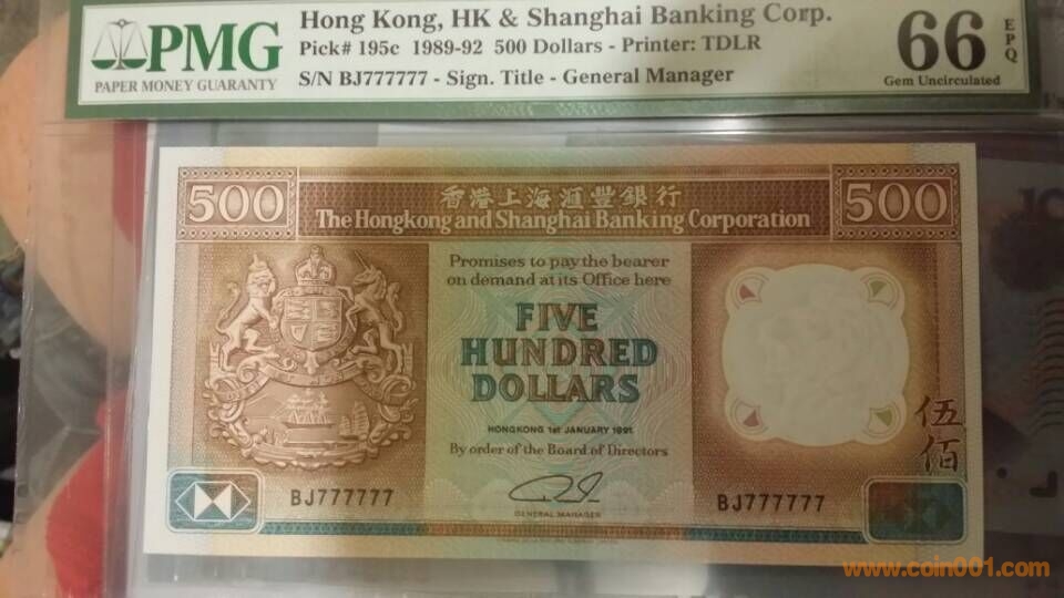 1)1991年,香港上海匯豐銀行伍佰元,BJ,777777,PMG,66,EPQ(BJ北京代號(hào)) 7500元