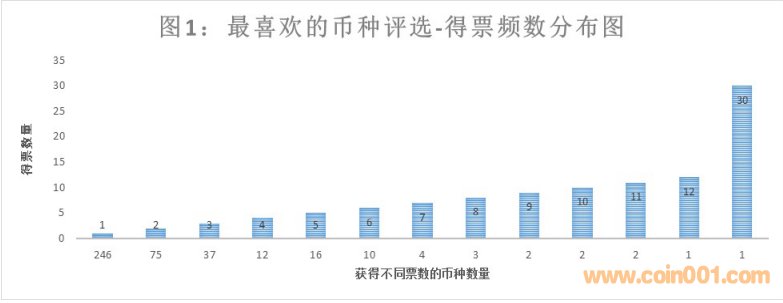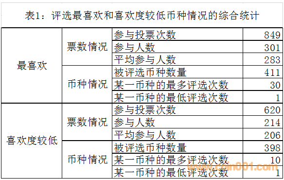 ??????1.參加評選最喜歡幣種的投票次數(shù)849次,參與人數(shù)301人,平均人數(shù)283人。被評選的幣種共計411枚,其中有一個幣種受到30次的最高點擊率。