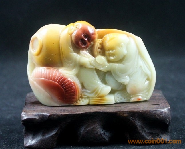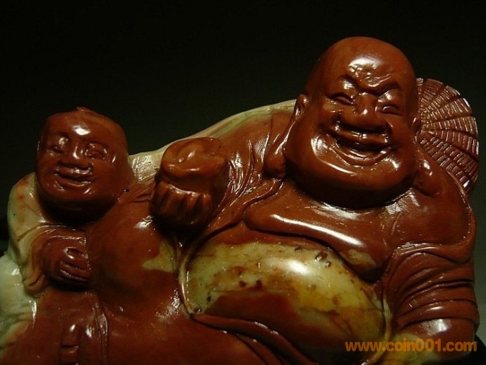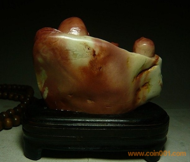 (6)壽山石之高山朱砂 童子戲佛擺件,石性穩(wěn)定,紅巧用得不錯,表情生動俏皮,很不錯的案頭小件,全品,無缺陷,數(shù)據(jù):凈長8.5公分,高7公分,厚3.2公分左右,底座原配贈送,包真包正宗壽山石,價格:950元,實在價格,不接大刀;