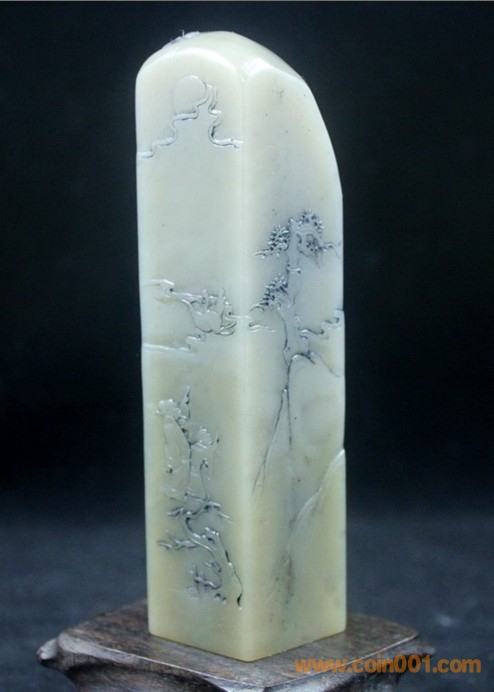 (4)壽山石之白高山石薄意方章《指日高升》,章高11.8公分、章面寬2.7*2.7公分,壽山石白高山質(zhì)地,較少見,周面山水人物薄意,指日高升題材,配木底座及錦盒,全品,無缺陷,包真包正宗壽山石,價格:850元,實在價格,不接大刀;