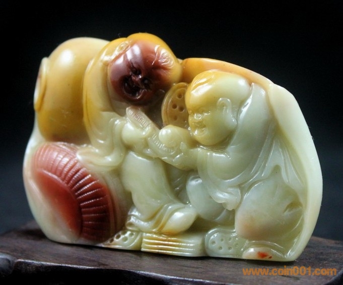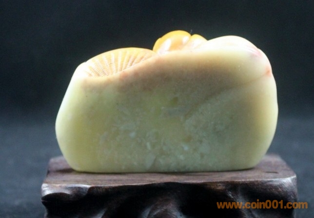 (1)壽山石之芙蓉石圓雕擺件《福壽雙全》,擺件高5.5公分、寬8.5公分、厚1.7公分,壽山石紅黃白三色芙蓉質(zhì)地,圓雕擺件,題材喜慶,寓意“福壽雙全”,里面刻畫蓮藕,也有“連生貴子”的意思,配送木底座,全品,無缺陷,包真包正宗壽山石,價格:850元,實在價格,不接大刀;