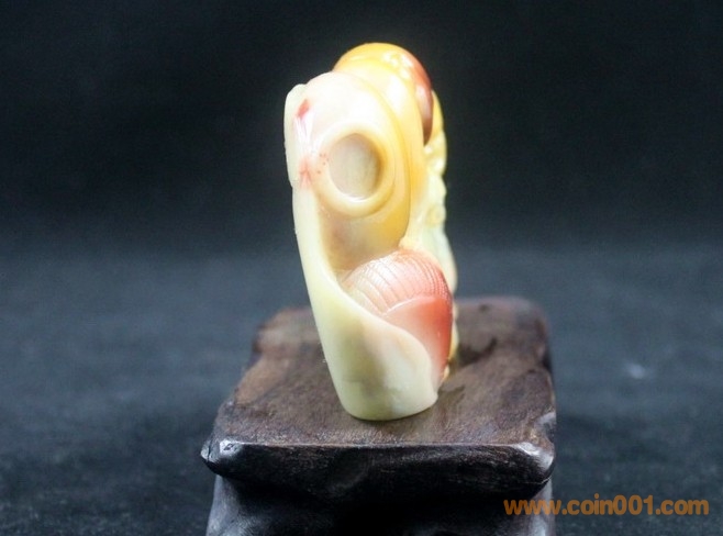 (7)壽山石芙蓉石 巧色蛟龍出海雕件,壽山中的芙蓉石品種,紅黃白三色芙蓉石,石質(zhì)少,質(zhì)地純凈無雜質(zhì),石質(zhì)溫潤,巧色也用得漂亮,全品,無缺陷,數(shù)據(jù):凈長7.3公分,寬4.9公分,厚2.7公分左右,包真包正宗壽山石,價格:650元,實在價格,不接大刀。 要兩件以上的包快遞,單要一件的運費自理,謝謝配合。