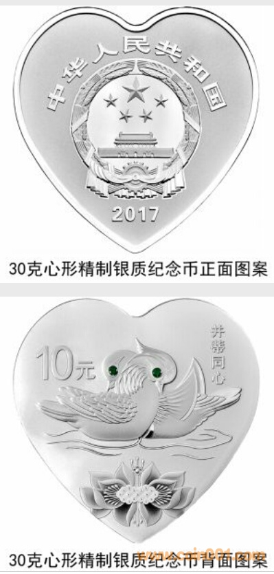 5克心形金質(zhì)、30克心形銀質(zhì)“并蒂同心”紀(jì)念幣(5月18日發(fā)行)背面圖案均為交頸鴛鴦、并蒂蓮花等造型組合設(shè)計,并刊“并蒂同心”字樣及面額。