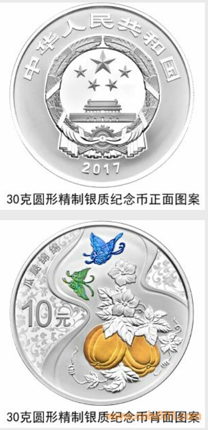 5克圓形金質(zhì)、30克圓形銀質(zhì)“瓜瓞綿綿”紀(jì)念幣(4月20日發(fā)行)背面圖案均為瓜、藤蔓、蝴蝶以及葫蘆圖形,襯以纏枝紋樣組合設(shè)計,并刊“瓜瓞綿綿”字樣及面額。