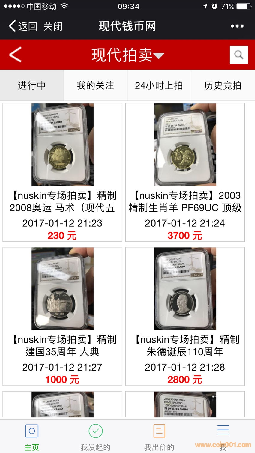 進(jìn)入到拍賣主頁,可以看到正在拍賣的拍品。在頁面頂部會員可以篩選“進(jìn)行中”“我的關(guān)注”“24小時上拍”“歷史競拍”的拍賣,也可以點擊現(xiàn)代拍賣后面的倒三角,按照拍品分類進(jìn)行篩選。