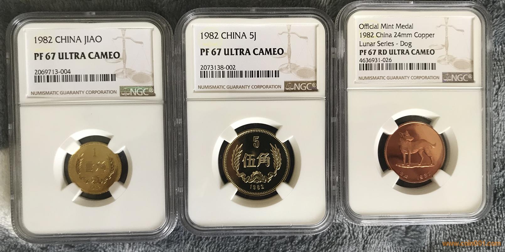 1982年精制壹角、伍角、狗章同分PF67UC