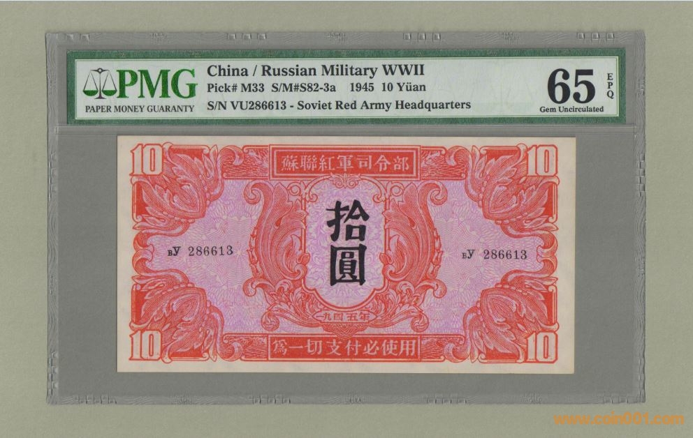 此票種為過度期使用,抗日戰(zhàn)爭末期蘇聯(lián)紅軍出兵東北,全殲了東北境內(nèi)的日軍。在此期間,由蘇聯(lián)紅軍司令部在東北地區(qū)發(fā)行紅軍票。紅軍票面額有1元、5元、10元、100元四種,票面上部印有“蘇聯(lián)紅軍司令部”字樣,中間印有面值,下部印有“一九四五年”和“為一切支付必使用”字樣,背面印有“贗造支票以戰(zhàn)時法處罰”。