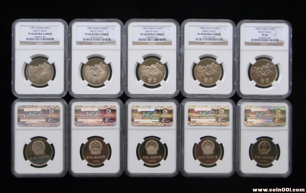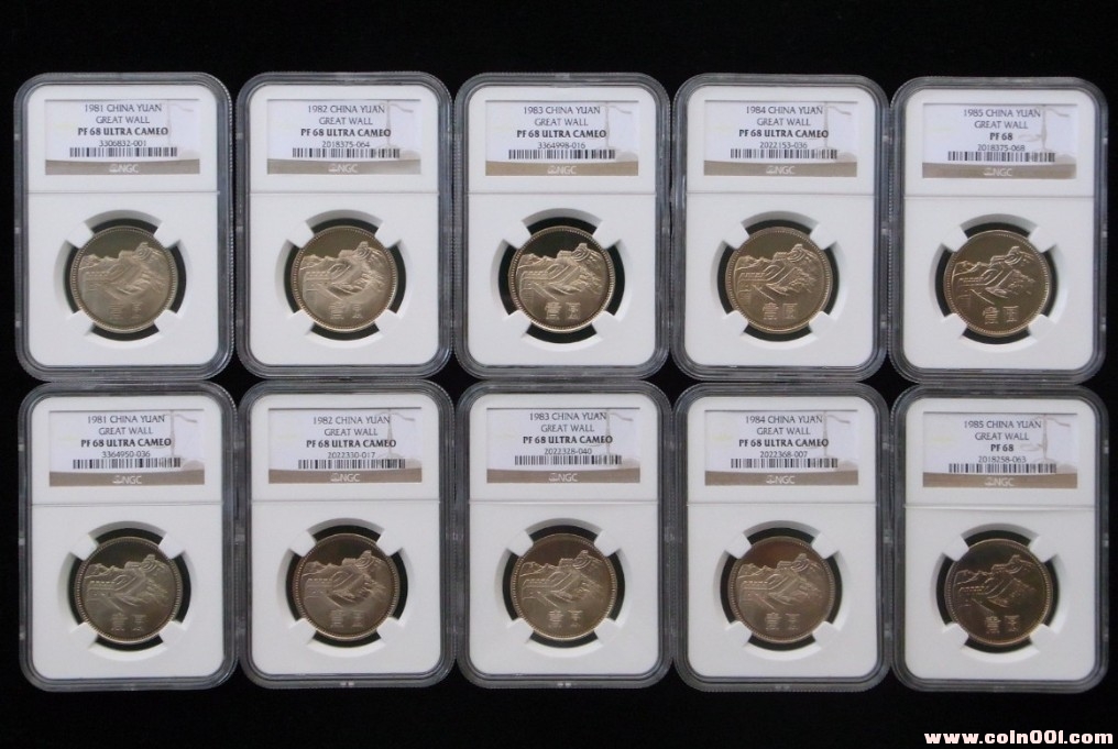 包括81年到85年精制長(zhǎng)城主幣一元兩套,全部為NGC PF68分,所有幣均為原汁原味進(jìn)盒。