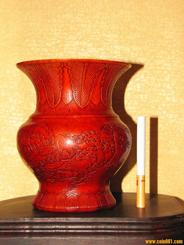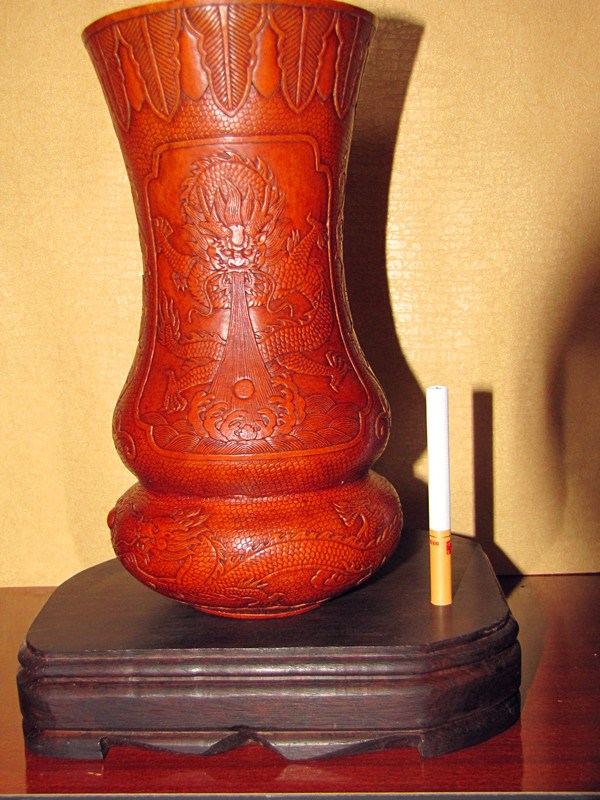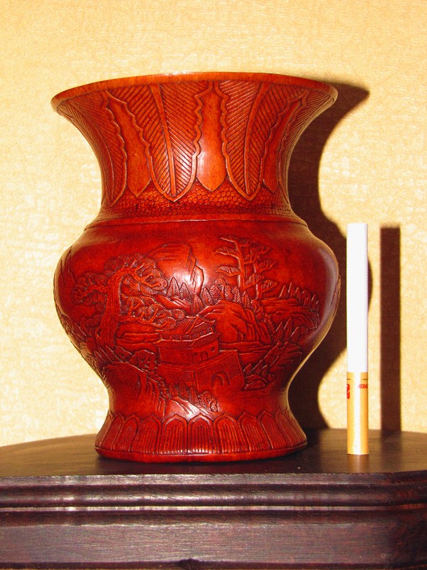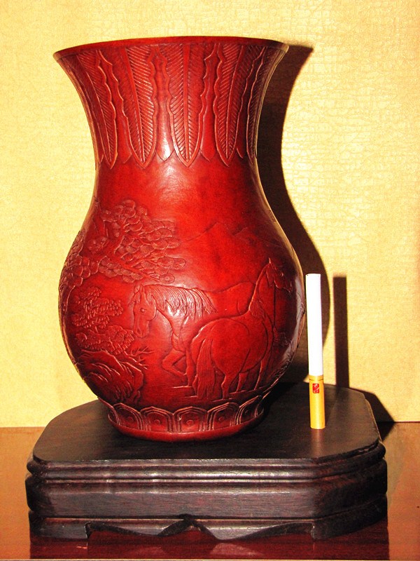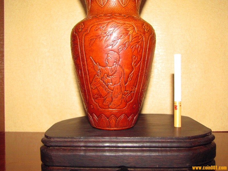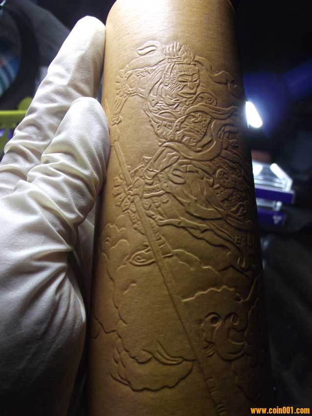 現(xiàn)在所見實物有少量帶"康熙賞玩"款識的,但真正形成流派,名家輩出,還是在晚清民國時期。其制作過程一般先要雙鉤物象草稿,再持刀沿邊線按壓出呈斜面的凹溝,兩側(cè)凹陷,則中間紋飾即凸顯而出。高手還能在很小的限度內(nèi)區(qū)分高低、深淺、虛實,層次分明。實際上,花紋并未高出表皮,這種欲陽先陰的意匠,極為巧妙。道光時徐某、近代天津陳錦堂等精通此技。押花葫蘆首先是圖案的組織,一把完整的押花葫蘆無論從哪個角度看,都是一副精美的山水,盛花鳥魚。其次是雕刻的技法,因為是淺浮雕,既要有層次感,有立體感,又要不能傷皮。因此要用瑪瑙刀一遍一遍的押、砑、趕、擠、按葫蘆表面,使之呈現(xiàn)浮雕花紋。線條要流暢更要有傳統(tǒng)藝術(shù)的韻味。葫蘆造型要以圖案匹配,這樣創(chuàng)作的作品深得海內(nèi)外人士喜愛。