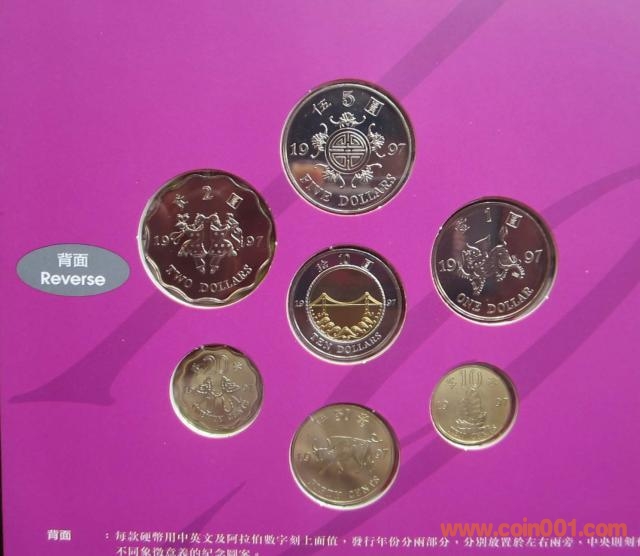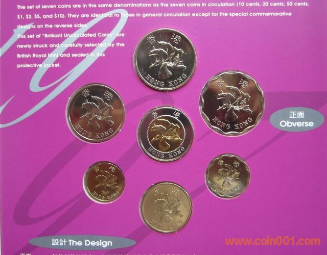 根據(jù)1984年12月19日簽署的中英聯(lián)合聲明,中華人民共和國政府將于1997年7月1日恢復對香港行使主權,香港將成為中華人民共和國的特別行政區(qū)。為紀念香港回歸這個歷史時刻,香港金融管理局發(fā)行一套七款的紀念錢幣。