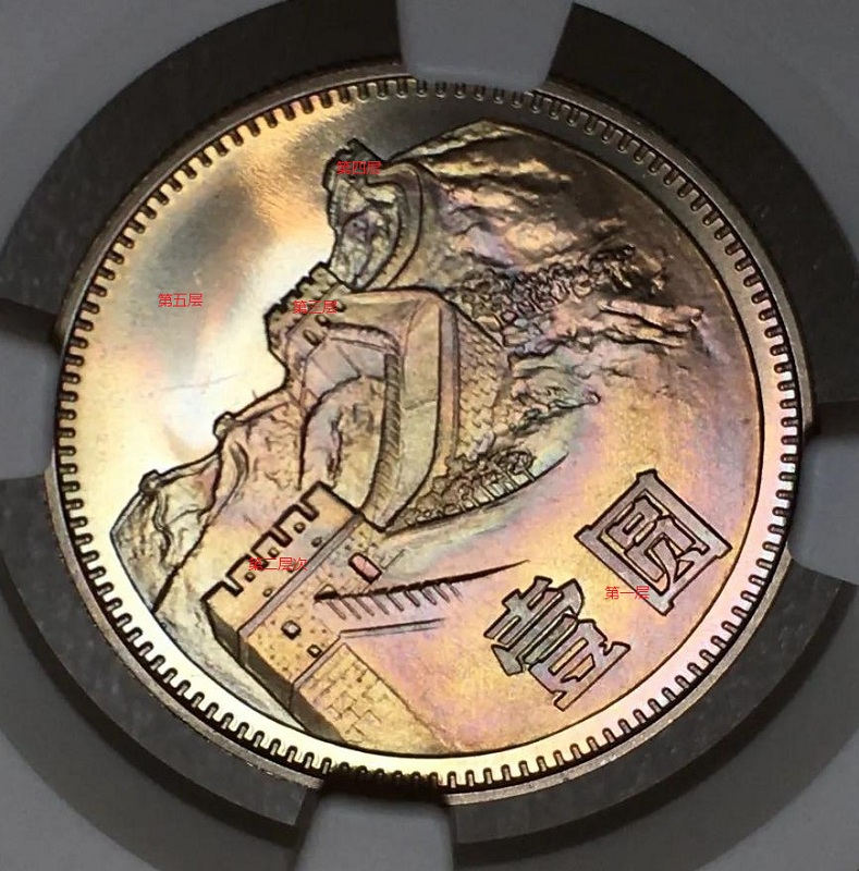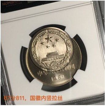 但問題來了,我們看到的長城幣國徽拉絲特別明顯,這也是拋光紋嗎?個(gè)人答案也是肯定的,同樣是拋光紋造成的拉絲效果,只是長城幣國徽的模具拋光紋造就拉絲是有意而為之。原因就是早期國內(nèi)的精制幣還在研發(fā)當(dāng)中,對于國徽噴砂的工藝還有難度。為了突出國徽的形象,在模具上造成較深和密集的同向拋光紋,壓制出來的幣通過光的反射形成明顯的拉絲效果,這大概可以說是當(dāng)時(shí)的一種“假噴砂”的做法吧。最早是運(yùn)用在了80冊上,后來在81年的幣品里面依然能看到,但83,85的這種手法就基本難看到了。