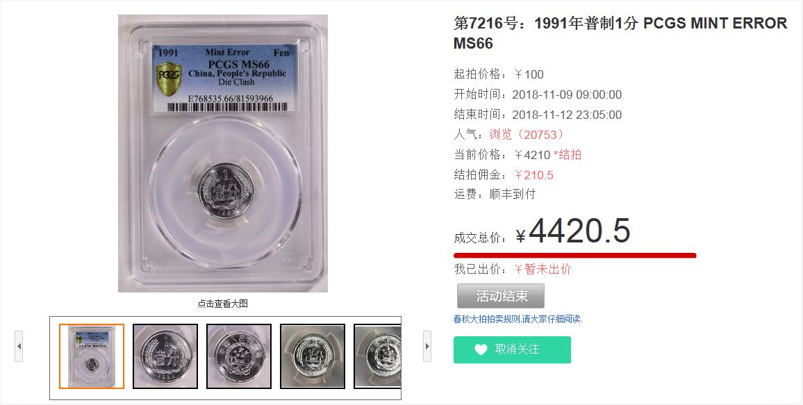 根據(jù)我近10年的各大拍賣(mài)場(chǎng)和群拍了解,權(quán)威硬幣收藏書(shū)籍查找,一塵網(wǎng)、現(xiàn)代網(wǎng)、趙涌在線等收集資料和圖片,微博、貼吧、網(wǎng)上搜索等,以及收藏家朋友了解,都沒(méi)有發(fā)現(xiàn)“鏡面狀態(tài)”的空模透打幣, 后來(lái)我通過(guò)送評(píng)國(guó)內(nèi)一流評(píng)級(jí)公司,公博評(píng)級(jí)GBCA MS69PL,一直珍藏到2018年現(xiàn)代錢(qián)幣網(wǎng)春秋大拍的春季大拍上拍,結(jié)果沒(méi)想到竟然成了本大拍絕對(duì)的“人氣王拍品”,達(dá)11208人次瀏覽,多輪角逐,大拍后,一幣難求!價(jià)格一路飆升到萬(wàn)元以上,儼然成了收藏“黑馬”!