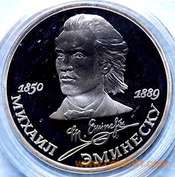 第46枚:作家埃米內斯庫逝世100周年紀念 ,1989年12月26日發(fā)行,直徑31毫米.