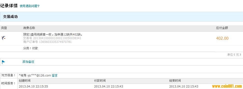 引用 引用第60樓zhanglf1981于2013-04-10 22:11發(fā)表的 : 預(yù)定1盎司純銀章一枚,加申通12塊共402塊十分鐘之內(nèi)轉(zhuǎn)多多支付寶。