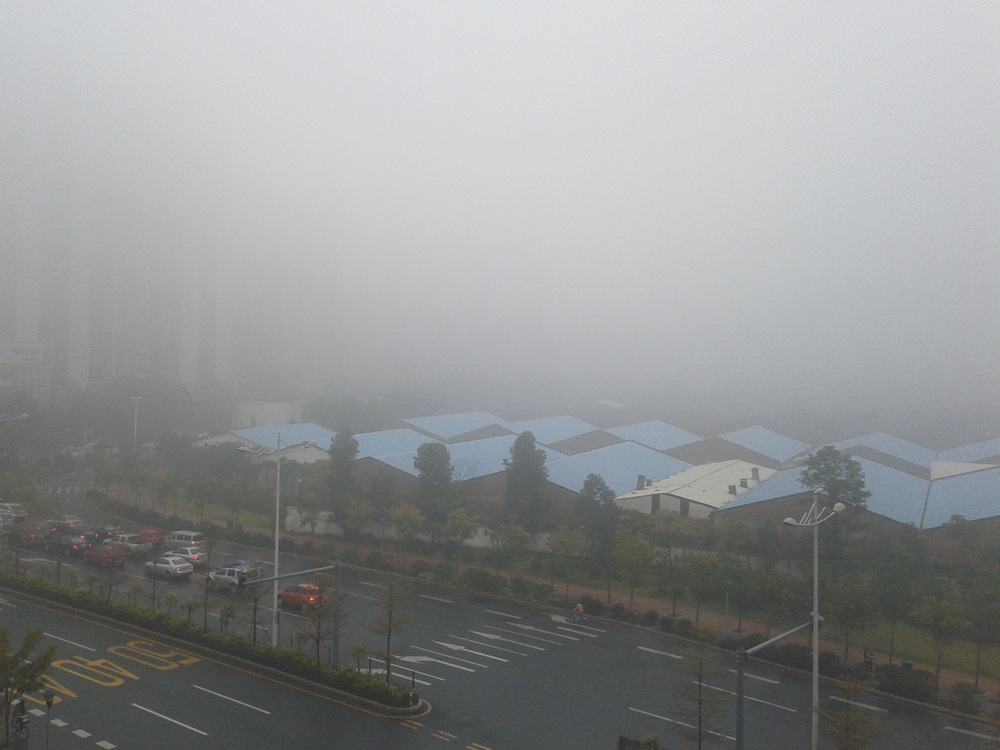 今天早上佛山出現(xiàn)罕見的濃霧天氣,能見度可能只有一、二百米,以往這個(gè)季節(jié)也常常出現(xiàn)大霧天氣,但是像今天這樣濃密的大霧是很少有的,忍不住在上班路上和辦公室內(nèi)拍了照片,以資分享