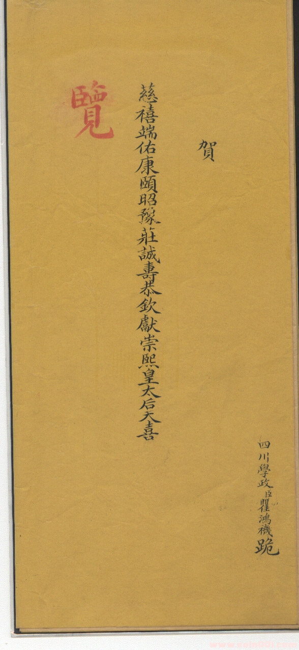 請安折由于特殊,因此在制作及書寫等方面都有嚴格要求。比如一般的奏折就用白紙折,而請安的則裝潢不同。尋常請安折,開面與底面都要用云龍黃綾裱褙,折身則用黃粉箋紙。如果遇元旦或萬壽(皇帝生日),請安折及其封套還會選用“鶴頂條魁”圖案的黃綾,而折身及內(nèi)襯則選用紅紙,以示高規(guī)格。當然,如果遇國喪期間,二十七日內(nèi),請安折也得用白紙而不能用黃綾。