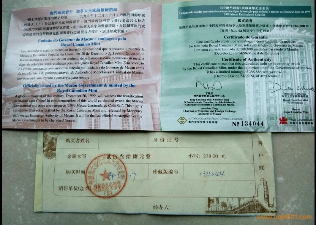 澳門回歸珍藏硬幣套裝