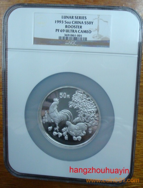1993年5盎司生肖雞銀幣NGC69===22000