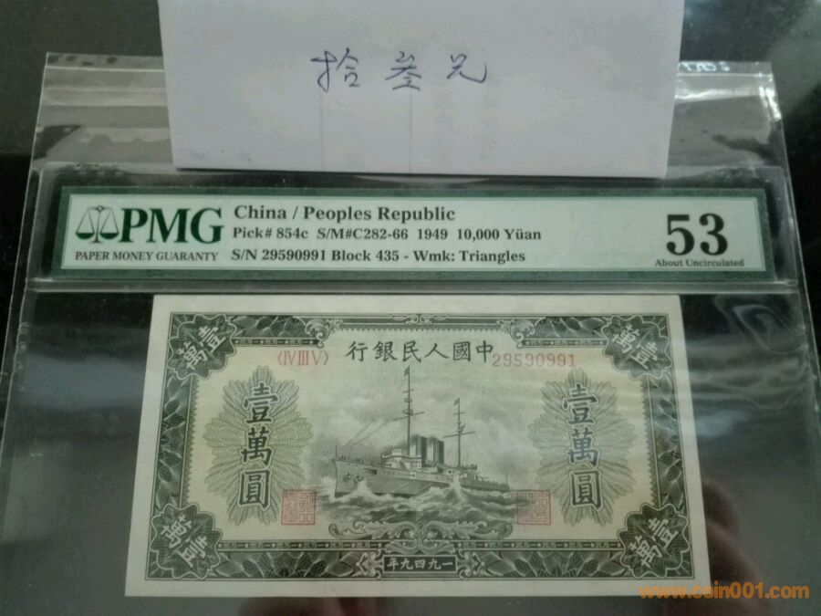 第一版人民幣一萬元軍艦,角水印。號碼29590991,pmg53,價格5300。