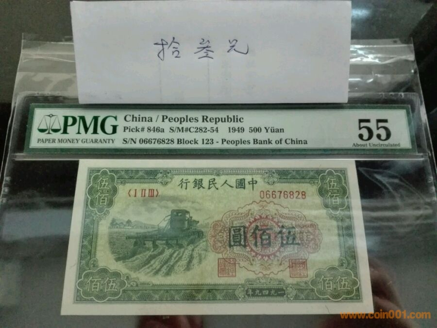 第一版人民幣五百元耕地,號碼06676828,pmg55,價格3300。