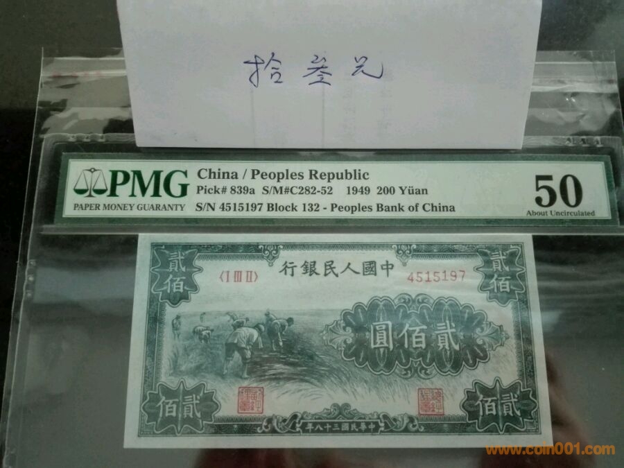 第一版人民幣二百元割稻,號碼4515197,pmg50,價格8300。一版幣極難入盒品種。(已出)