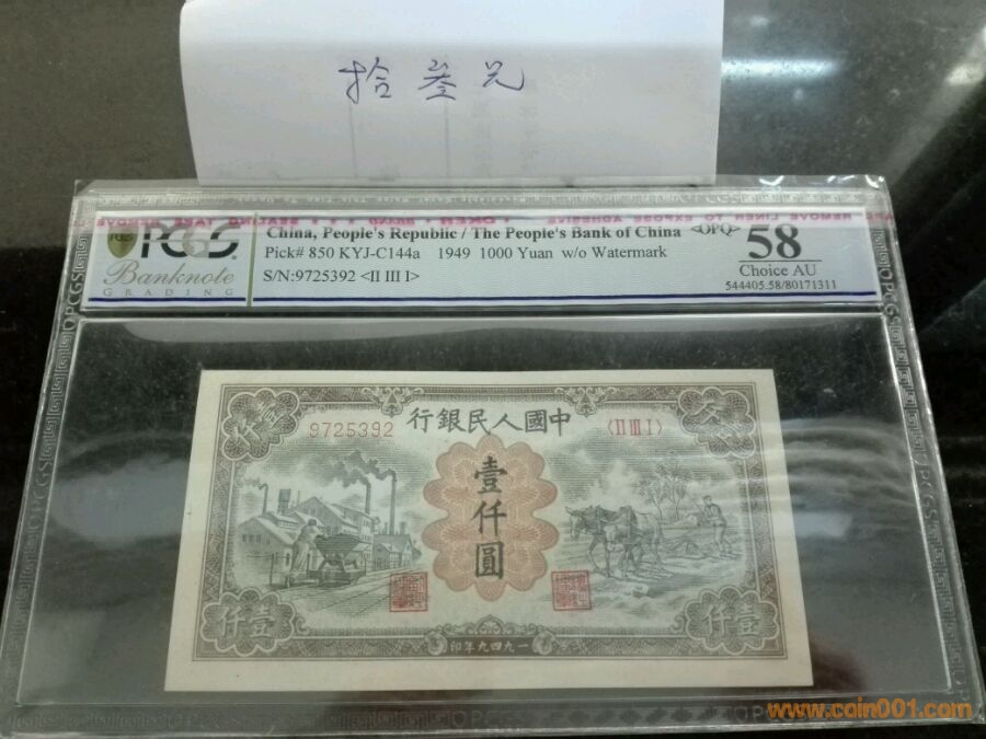 第一版人民幣一千元驢子礦車,號碼9725392,pcgs58opq,價格8900。