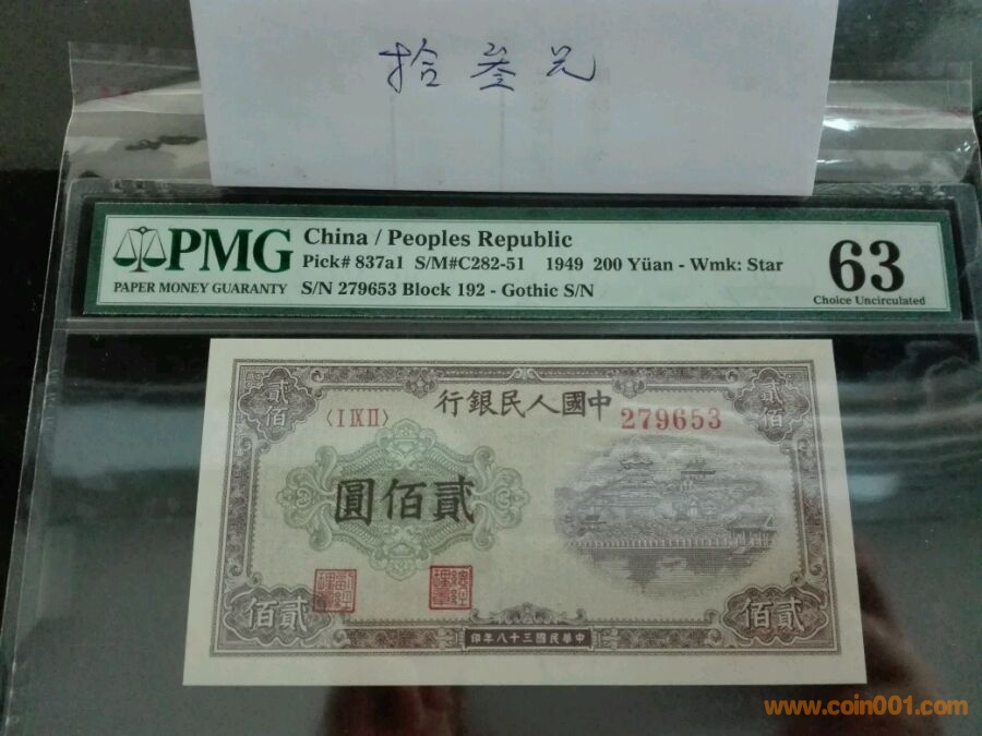 第一版人民幣二百元排云殿,號碼279653,pmg63,價格6000。一版幣難入盒品種。
