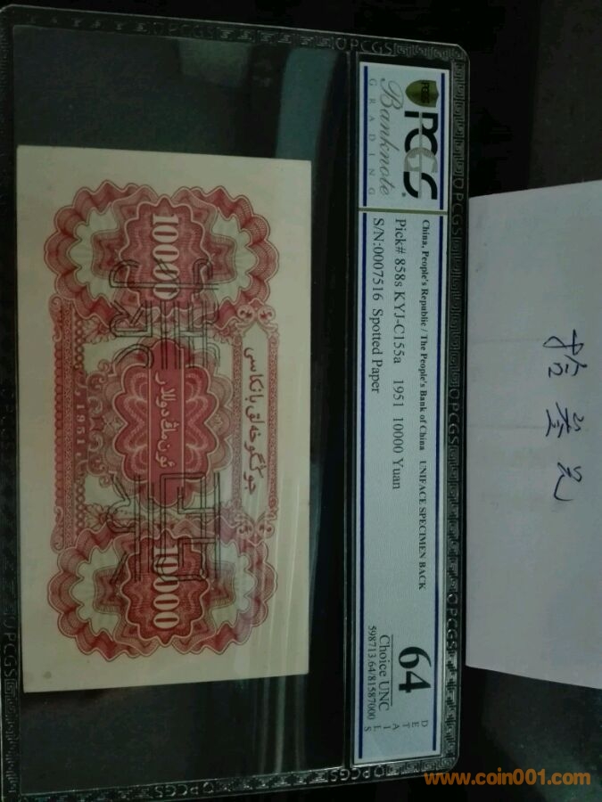 第一版人民幣一萬元駱駝隊票樣,pcgs58/64。樣張?zhí)柎a相同,第一版人民幣四珍之一。價格23000。