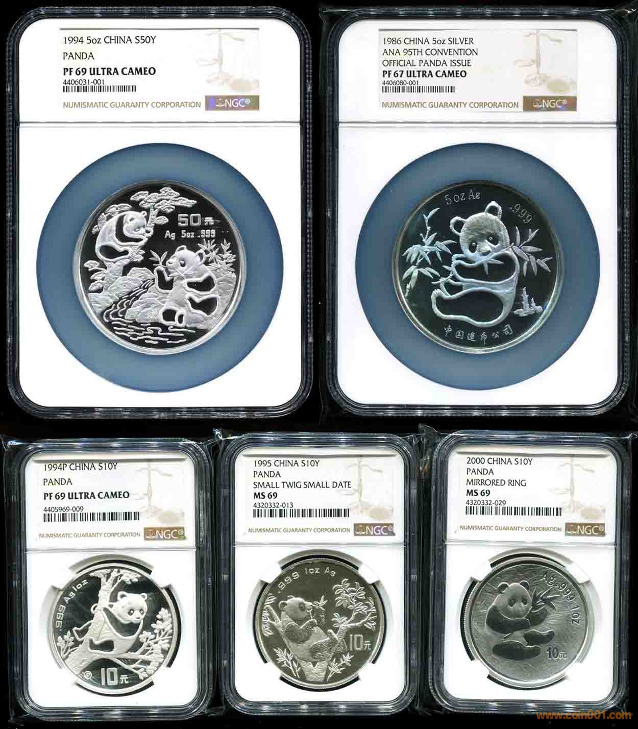 惠售;NGC 69級 1994年P版熊貓、1995年細枝小字版 V字版本、2000年上海版本 光圈版本熊貓、1994年5盎司熊貓、1986nian 美國錢幣協(xié)會第95屆年會5盎司