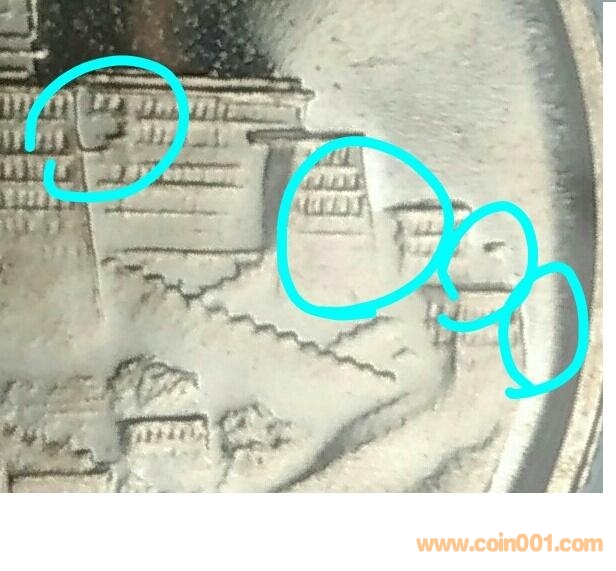 我說一下我認(rèn)為的為什么這是禮品裝精制幣,把普通精制和禮品裝圖案不同處說一下,供朋友們指正。附上我這枚幣(有圈的圖先前貼中也有)和原裝禮品裝幣2圖,請(qǐng)朋友們?cè)賲⒄瞻嬷麈溄又械钠胀◣拧?br />1.右數(shù)第一個(gè)圈內(nèi)(邊緣處),禮品裝沒有像耳朵樣房子,就像少一小塊。普通版有一突出建筑。