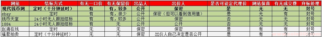 中國現(xiàn)代錢幣網(wǎng)近期推出了在線拍賣的新程序,從論壇發(fā)貼的初級競價模式升級到程序競價是各個在線網(wǎng)站都要經(jīng)歷的必由之路。筆者選取了目前主流的幾家錢幣網(wǎng)站的拍賣程序,對幾方面的因素進行了比較,以表格形式展現(xiàn)出來,供大家討論。