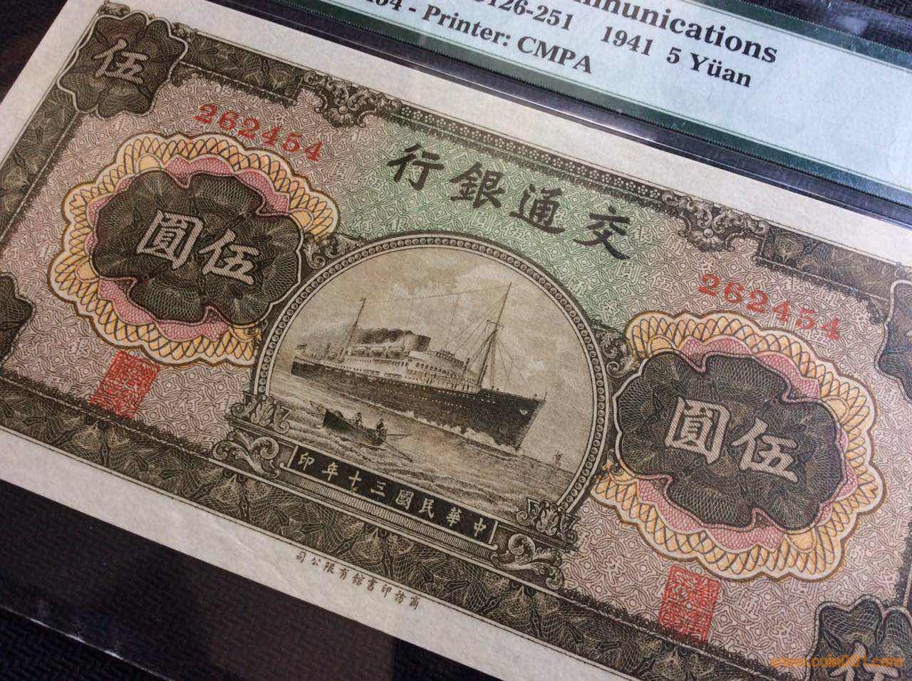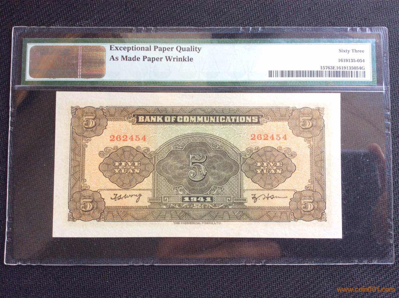 1941年商務(wù)版交通銀行伍圓輪船,采用凹版印刷。全新原票未流通無人為處理(63E),正面下方商務(wù)印書館字樣左側(cè)鈔紙帶造紙過程形成皺紋(詳見圖3),是該票扣分原因,標(biāo)簽背面有標(biāo)注Exceptional paper quality as made paper wrinkle.