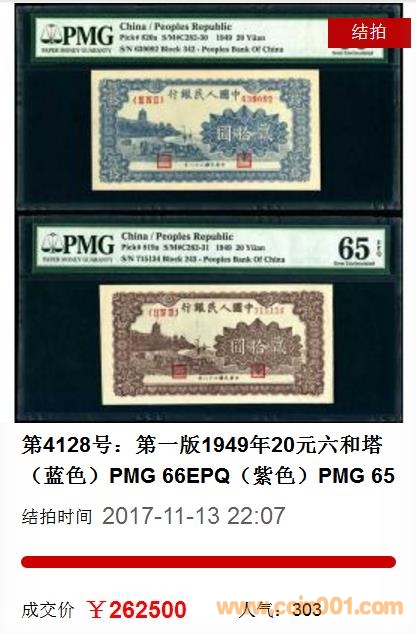 ????二、紙幣部分也有多項(xiàng)亮點(diǎn)。第4128號(hào):第一版1949年20元六和塔(藍(lán)色)PMG 66EPQ(紫色)PMG 65E,本項(xiàng)拍品均為PMG冠軍分,其中藍(lán)色六和塔是唯一冠軍分,最終以